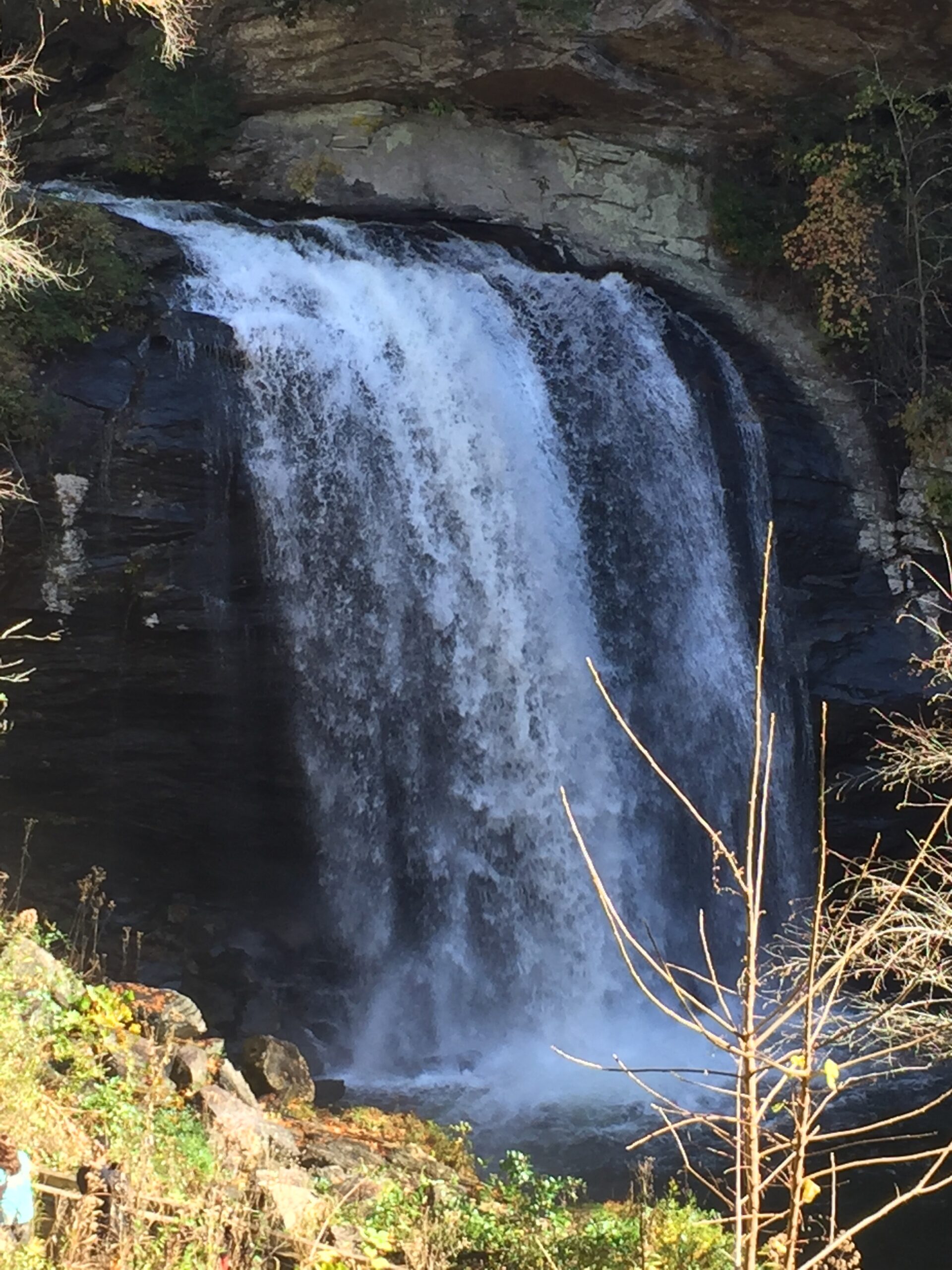 After crossing into North Carolina, is a breathtaking 60 foot waterfall that goes by the name of Looking Glass Falls.