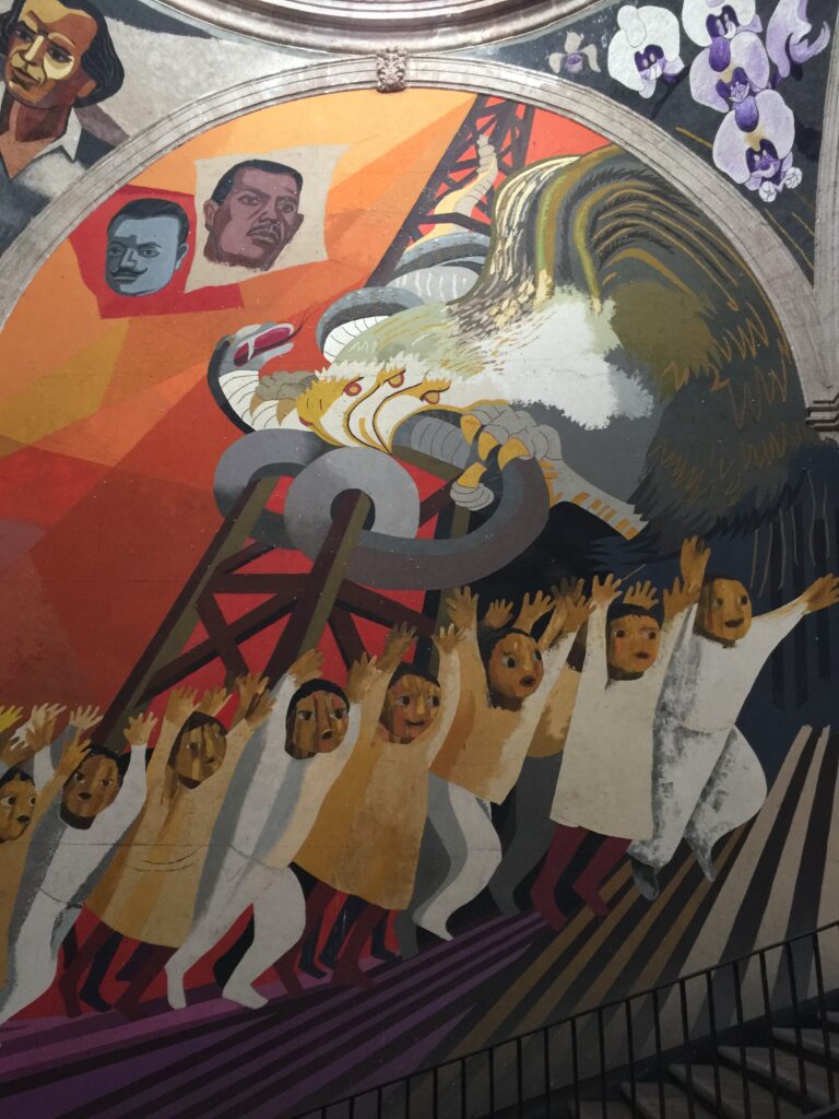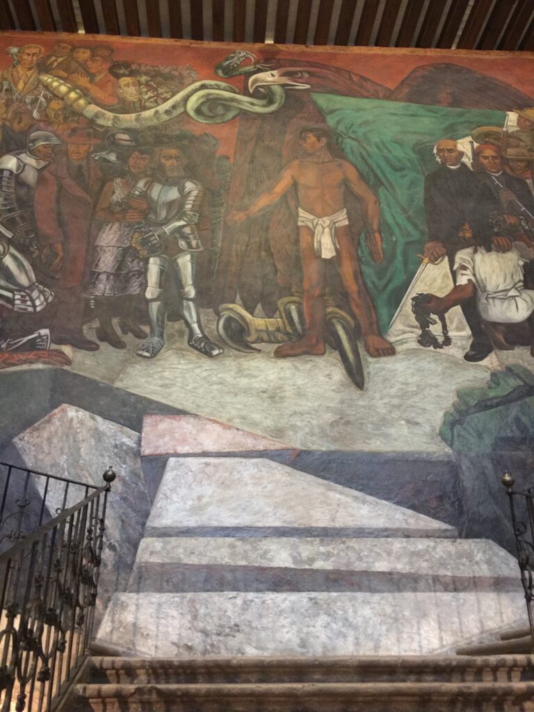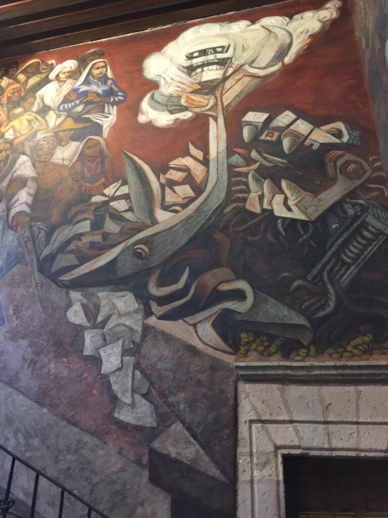 Unfortunately, rain was still falling, so I went to the Centro Cultural Clavijero. Centro Culturales are common in Mexican cities, they tend to host local art. Of course, there were murals; these ones were mind-bendingly spectacular.