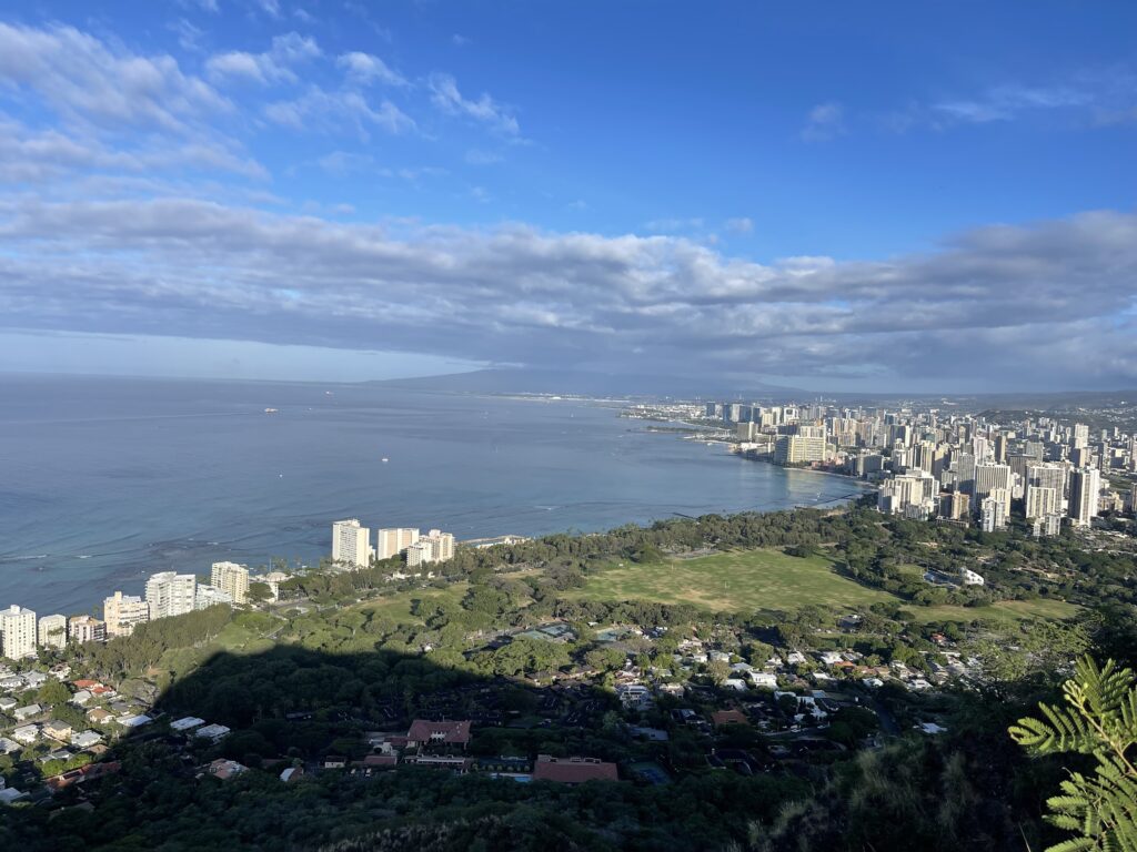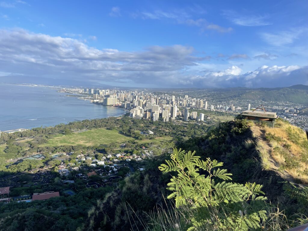 Finally, I had reached the top. The view is the classic one sees when seeing images of Honolulu: Waikiki Beach with all its hotels. Unfortunately, the image is a concrete jungle with a sliver of beach. The relatively untouched area in the foreground is more beautiful.