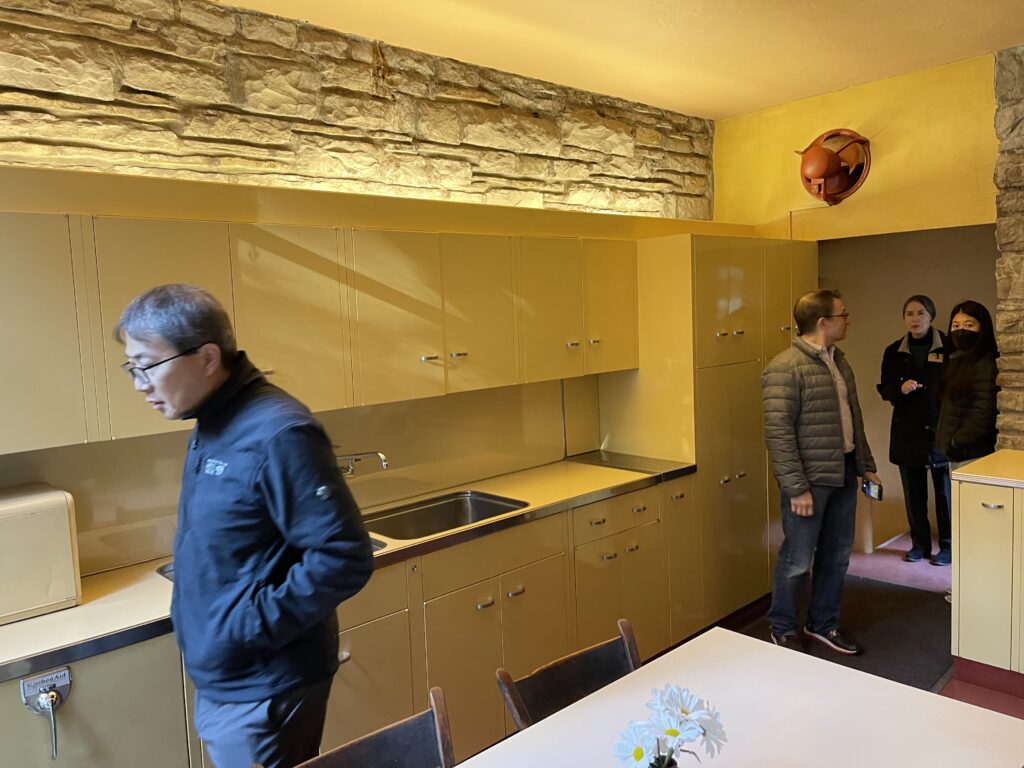 The dining room had interesting looking chairs and also floating shelves, once again ahead of their time.